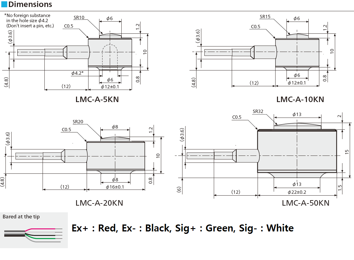 직경:12±0.1mm(5, 10kN), 16±0.1mm(20kN), 22±0.2mm(50kN)