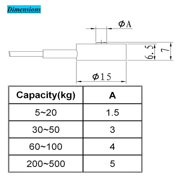 소형압축로드셀 Range : 5,10,20,30,50,100,200,300,500kg 고정단 TAP 없음 정밀도 ≤ 0.3% |