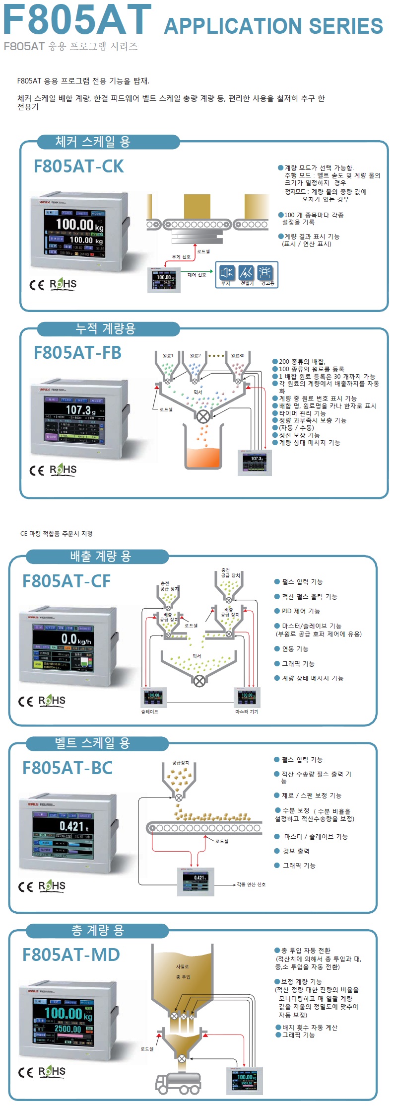 F805AT는 컬러 LCD 터치 패널을 채용해 중량 표시, 각종 설정값 표시, 상태 표시의 시인성을 대폭 향상시켜 간편하고 편안한 조작이 가능합니다. 1000회/초의 작동 속도로 고속 A/D 변환 및 디지털 처리 기능을 제공합니다. OMRON DeviceNet 및 MITSUBISHI CC-Link를 포함한 주요 PLC에 직접 연결할 수 있는 풍부한 인터페이스가 있습니다. 계량 시스템용으로 특별히 개발된 F805AT는 최고급 계량 인디케이터라 할 수 있는 일체형 일체형 장비입니다.