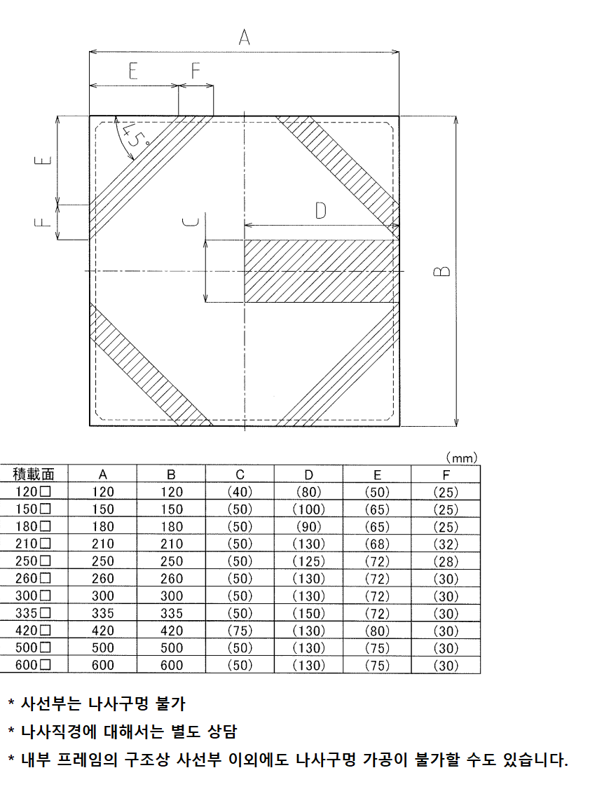 사이즈 적재면:120□~600□ 높이:21mm~39mm