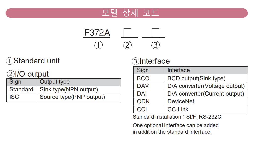 | BCO | BCD 병렬 데이터 출력 인터페이스 (싱크타입) (옵션) |