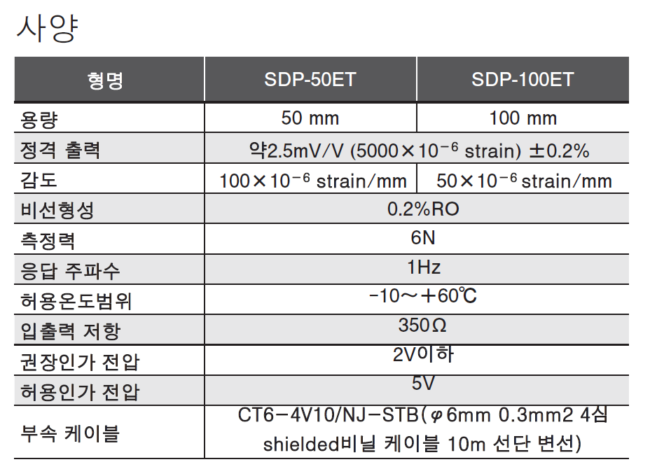 | SDP-50ET | 50mm | 2.5mV / V (5000x10 -6 Strain) ± 0.2 % | 100 | 0.2 % RO | -10에서 +60 ℃ |